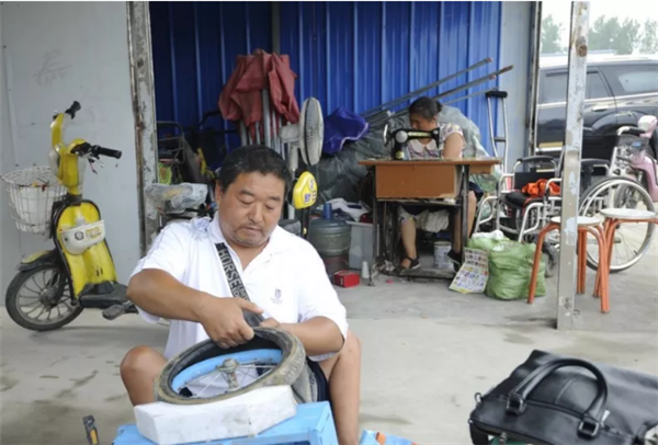 夫妻俩在一起经营的修车铺和缝补点
